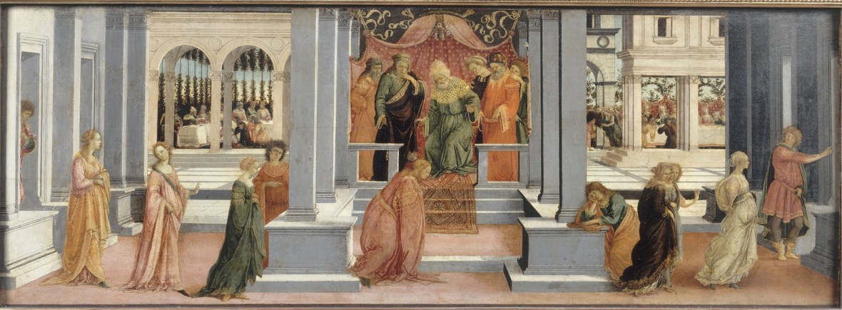 Visuel : Sandro Botticelli et Filipino Lippi, Scène de l’histoire d’Esther : Le choix d’Esther par Assuérus, vers 1475, tempera sur bois, 47 x 131 cm, Chantilly, musée Condé