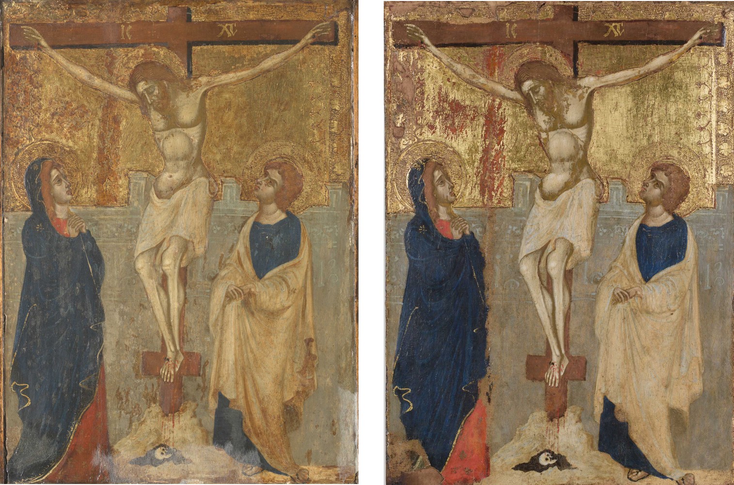 Anonyme des Abruzzes, Le Christ en croix, vers 1420-1440. Tempéra sur panneau de peuplier. H.0, 35 m ; L. 0,26 m. Abbeville, musée Boucher-de-Perthes. (Avant restauration ©C2RMF/Gérard de Puniet- Après restauration ©C2RMF/Thomas Clot)
