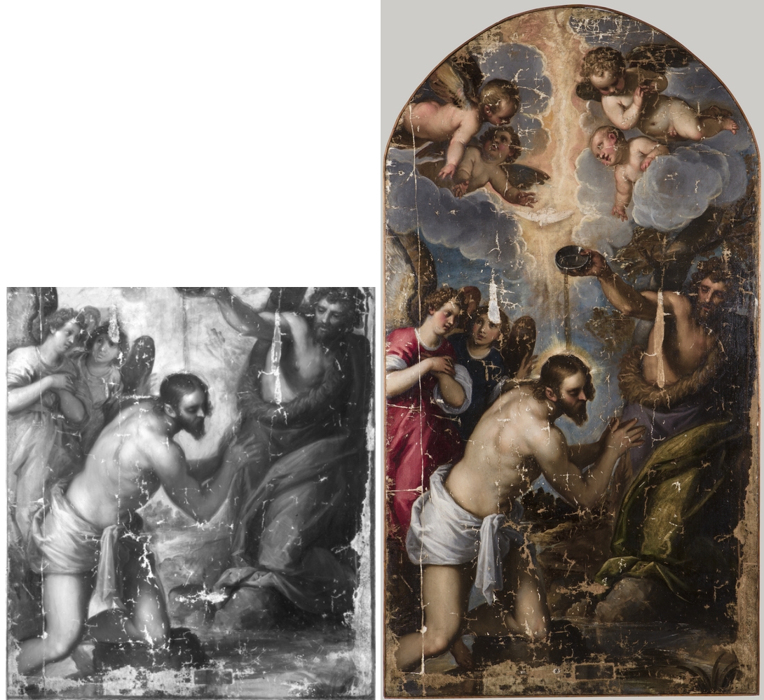 Palma le jeune, Le Baptême du Christ, entre 1548 – 1628. Huile sur toile. Fontaine-Chaalis, abbaye royale. (Avant restauration : réflectographie dans l’infrarouge ©C2RMF/Jean-Louis Bellec – Ensemble en cours de réintégration ©C2RMF/Thomas Clot)